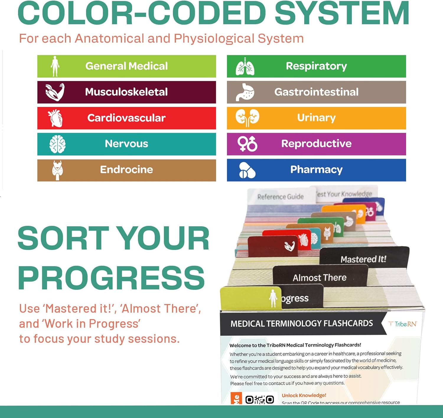 ORGANIZED & ACCESSIBLE: The flash cards are stored in a sturdy lift-off lid box with rounded corners on dividers, making sorting a breeze. Three bonus sorting cards—“Work in Progress,” “Almost There,” and “Mastered It!”—help plan study sessions effectively.