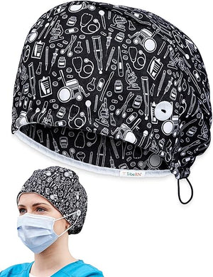 FACE MASK COMPATIBLE: Show off your style and enhance safety with the aesthetic pearl buttons on either side of the surgery cap that allow easy attachment of face masks; This thoughtful feature helps alleviate ear pain and discomfort, making those long hours more bearable